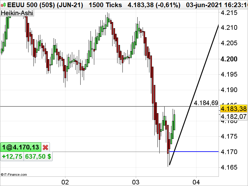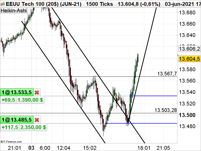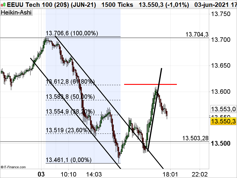 En el gráfico  de 1500 ticks, desde el día 3 de junio los precios  en 13.704 hicieron máximos intra diario, para formar una tendencia bajista  al comienzo del día. Los precios aceleraron la proyección en la apertura del mercado USA, para a las 16 horas estar sobrevendido, 200 puntos de caída sin rebote era una sobreventa totalmente clara. Parecía que muchos operadores pensaran que estábamos en venta pánico, por la velocidad de las transacciones.