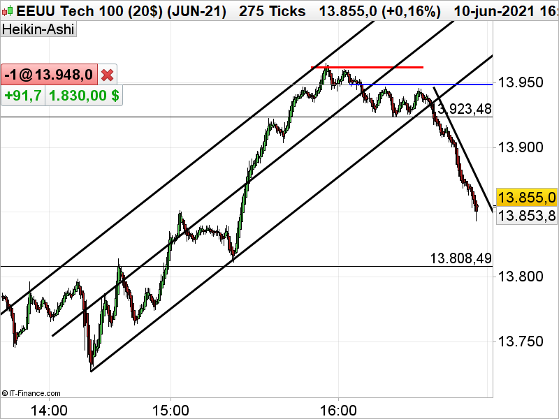 En este grafico de 175 ticks, en el eje de la línea de regresión abrimos la posición corta con la esperanza de que caiga a los soportes inferiores13.808 es el objetivo, anteriormente en 13850 tiene un punto de apoyo que pudiera rompernos la directriz bajista. Si esta es rota la posición se cierra a mercado.