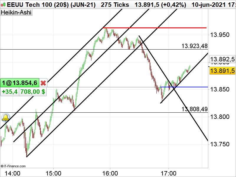 En este grafico de 275 ticks, la directriz bajista anterior fue tocada y la posición cerrada. Hemos creído en ese momento que la proporción de retroceso fue el aproximado y abrimos una nueva posición larga en el soporte resistencia de 13850, metiéndonos en pérdidas en un momento de terminado, para a continuación tomar tendencia alcista. Trazamos la directriz y nos mantendremos en la posición con la esperanza de que nuevamente los precios se dirijan a resistencias del máximo diario.