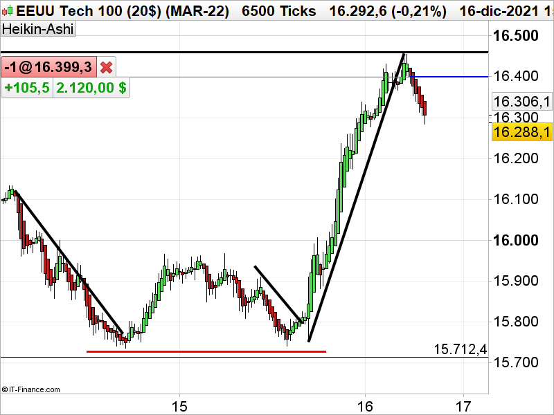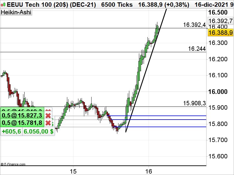 En estos movimientos están las grandes oportunidades si se sabe entrar en el momento en el lugar y la hora, a parte de la serenidad de para controlar las emociones y las tendencias previstas para conseguir en tendencia alcista 1.693 puntos y en la bajista 375 puntos en el momento de la grabación de los gráficos por una suma de 2.069 puntos día con diferentes contratos.