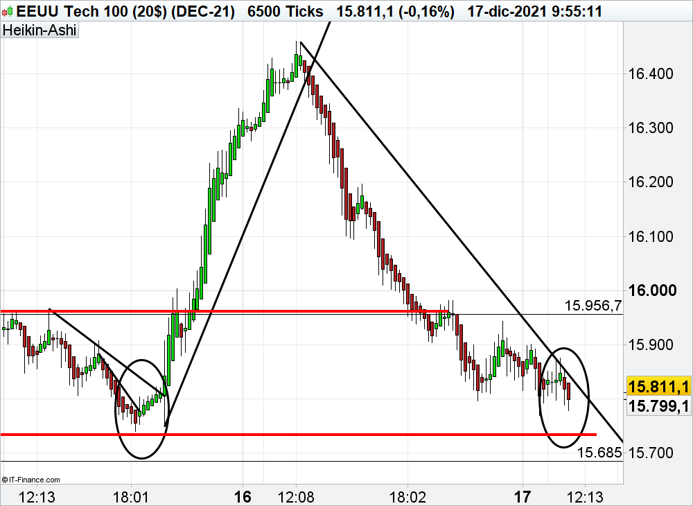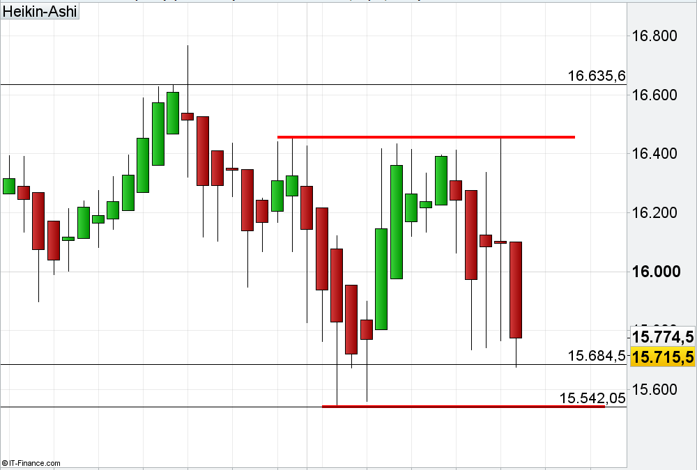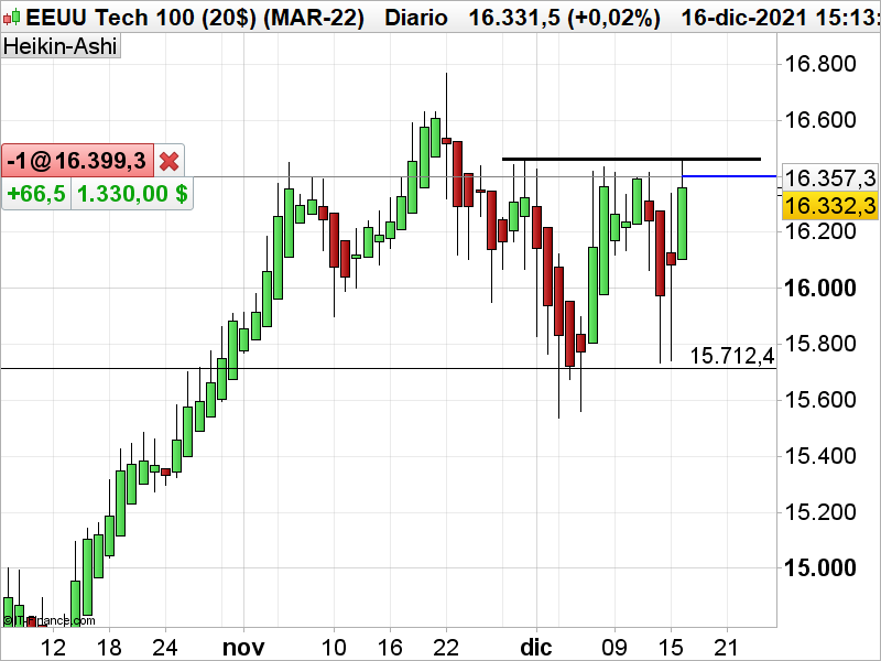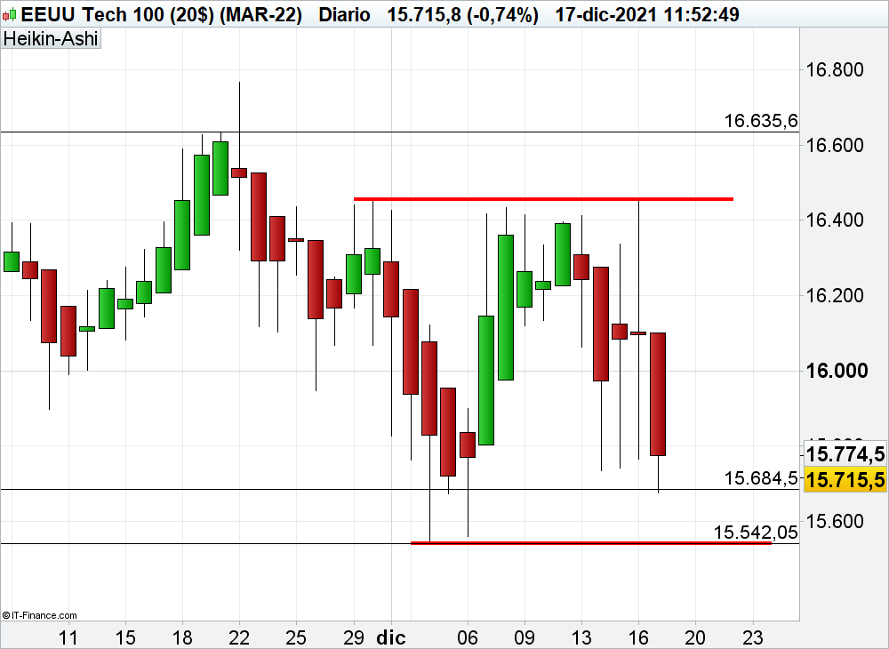 En el gráfico diario se ve como estamos en un lateral con un rango diario de 15.684 a 16.456 como techo máximo.