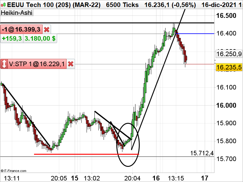 Grafico de 1500 ticks. El mercado parecía sobrevendido e intentamos conseguir el rebote del mercado en busca del “gato muerto”.